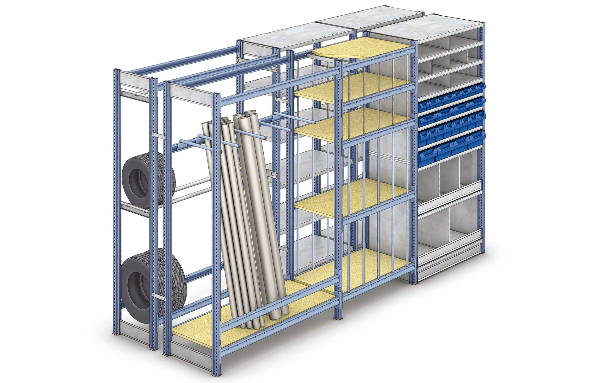 Gracias a la combinación de una amplia gama de componentes y accesorios, las estanterías M3 se adaptan a la perfección a diferentes tipos de cargas (piezas pequeñas, cajas, paquetes o documentos, entre otros) y a distintos entornos de trabajo (almacenes, talleres, centros productivos, tiendas y oficinas).